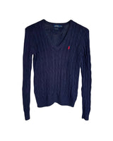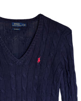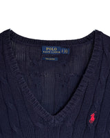 RL Navy & Red Logo V-Neck Cable Knit Sweater, Size S